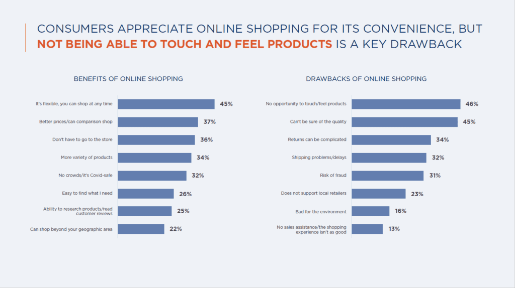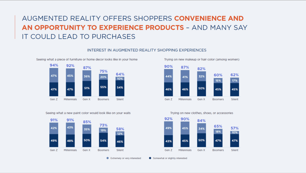 The pandemic also moved more people to shop online, and while most appreciate the convenience, not being able to touch a product or ensure its quality are seen as the major drawbacks. Could augmented reality shopping fill the gaps? Among shoppers who expressed some interest in an AR-shopping experience, 3 out of 4 say it could lead to a purchase.
