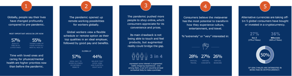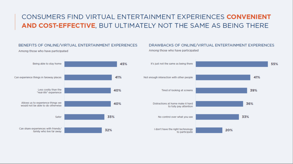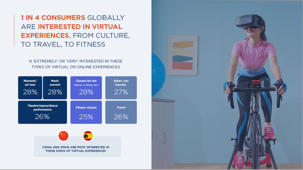 Demand for virtual culture and entertainment during the pandemic also grew as people moved online to work out, take classes, see concerts, travel, or experience culture. About 1 in 4 consumers globally are interested in these types of virtual experiences but say it’s just not the same as being there in person. Will immersive technology be able to replicate the feeling of being there in person in the metaverse?