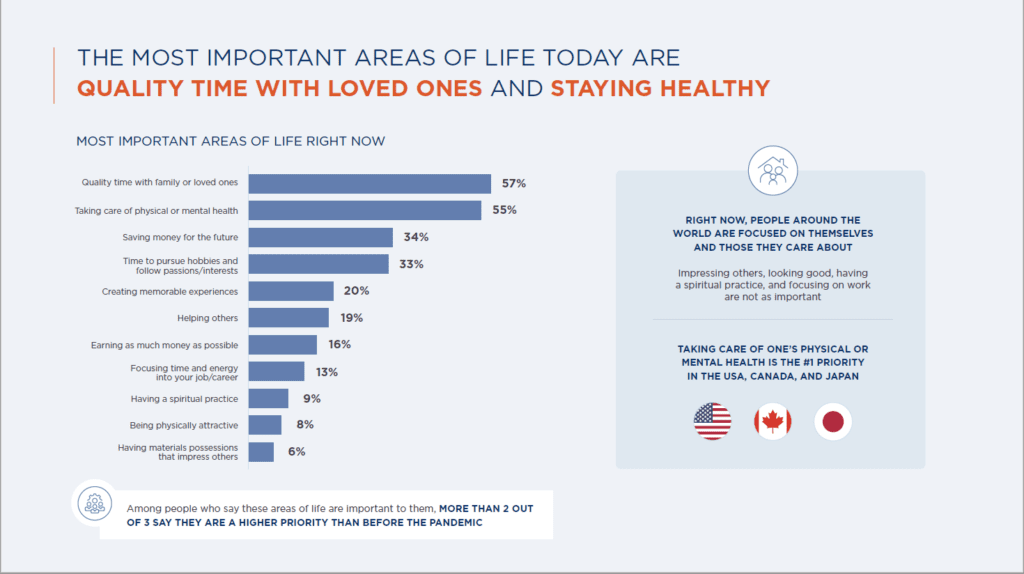 Spending quality time with loved ones and taking care of physical and mental well-being are now the top two priorities in life