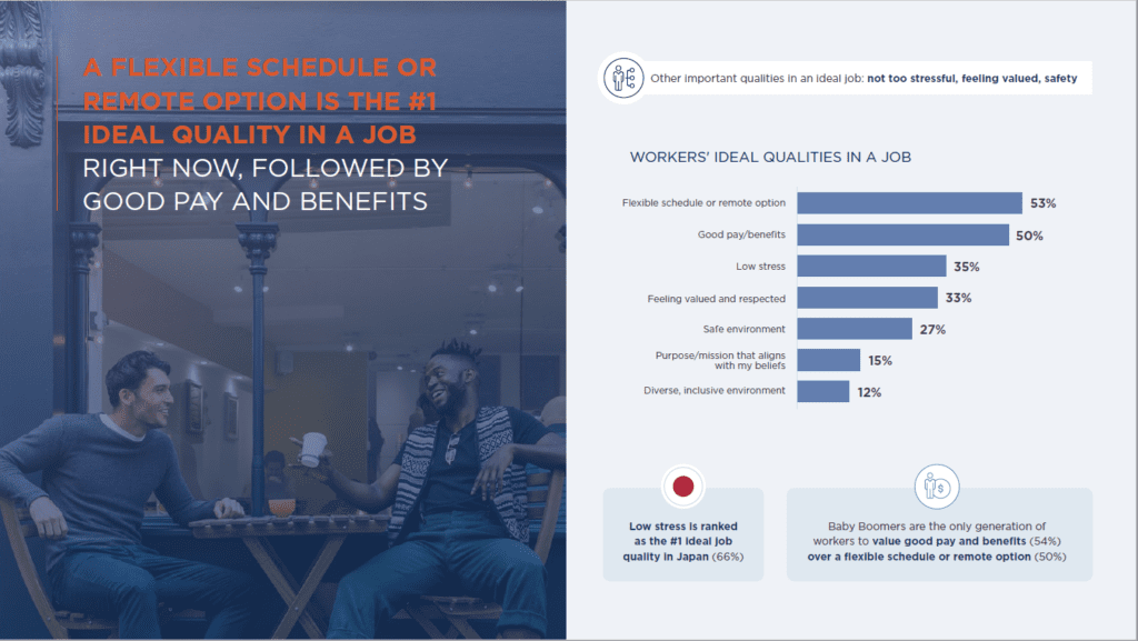 A flexible schedule or remote option is the #1 ideal quality in a job right now, followed by good pay and benefits