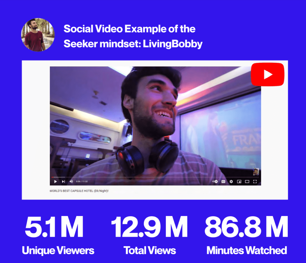 LivingBobby es un vlogger de viajes cuyo contenido tiene como objetivo capacitar a otros buscadores para viajar “más lejos y más profundo con corazones y mentes ilimitados” e inspira a más de 5 millones de espectadores mensuales con su contenido. No hay mejor lugar para satisfacer la mentalidad de un buscador que en el video social.