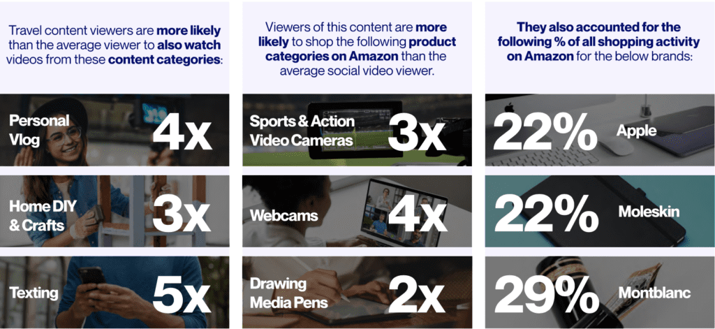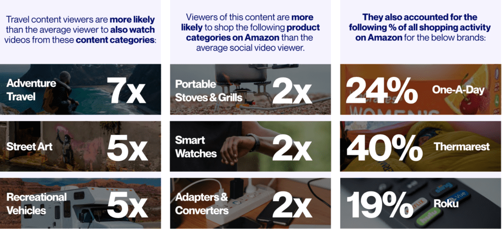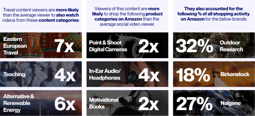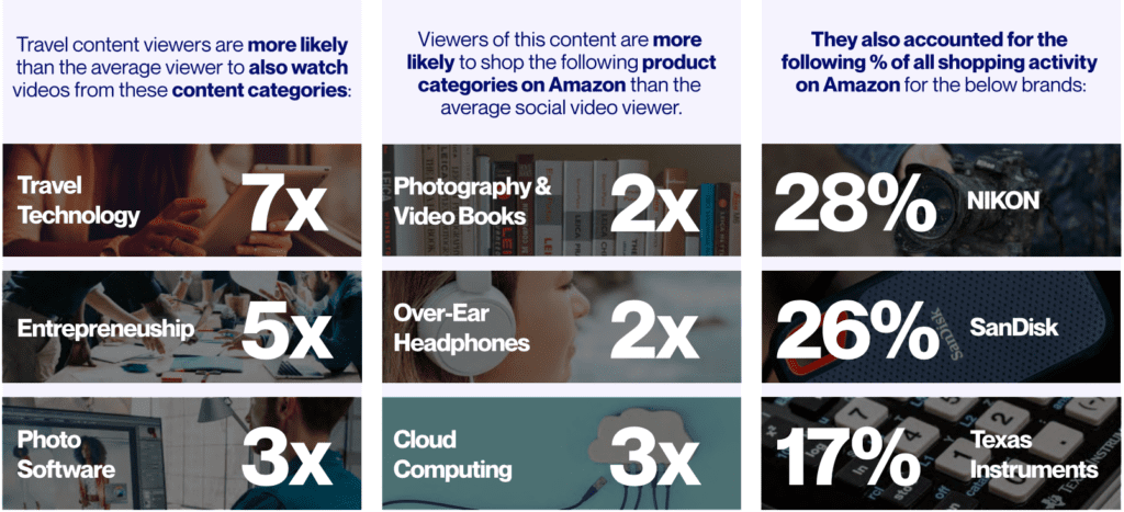 - Por ejemplo, los contenidos sobre viajes influyen en el 29% de las compras de bicicletas de montaña y en el 30% de las ventas de sopa de fideos ramen, y es 3 veces más probable que esta audiencia compre equipos de realidad virtual que otras audiencias de video social.