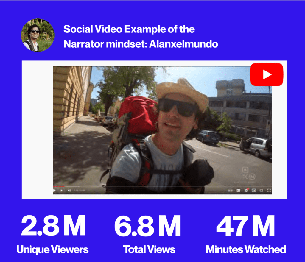 El aumento de la importancia y el poder del video social debe verse como una oportunidad para que su marca cree productos, mensajes o contenido alineados con una o más mentalidades de la reciprocidad de los viajes. Los Narradores dependen del video social para documentar sus roles en el proceso de viaje. Los Buscadores no podrían sumergirse en los viajes solo con fotos y textos. Los Nómadas no tienen acceso a televisores tradicionales mientras viajan, pero sí a teléfonos móviles y tabletas. El contenido de video social es un canal vital para cualquier estrategia de marketing, pero especialmente crucial para involucrar a viajeros altamente motivados.