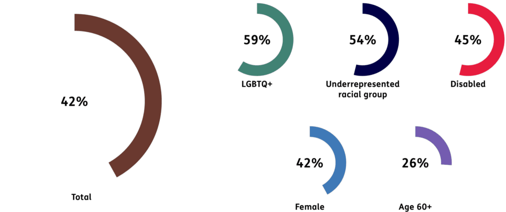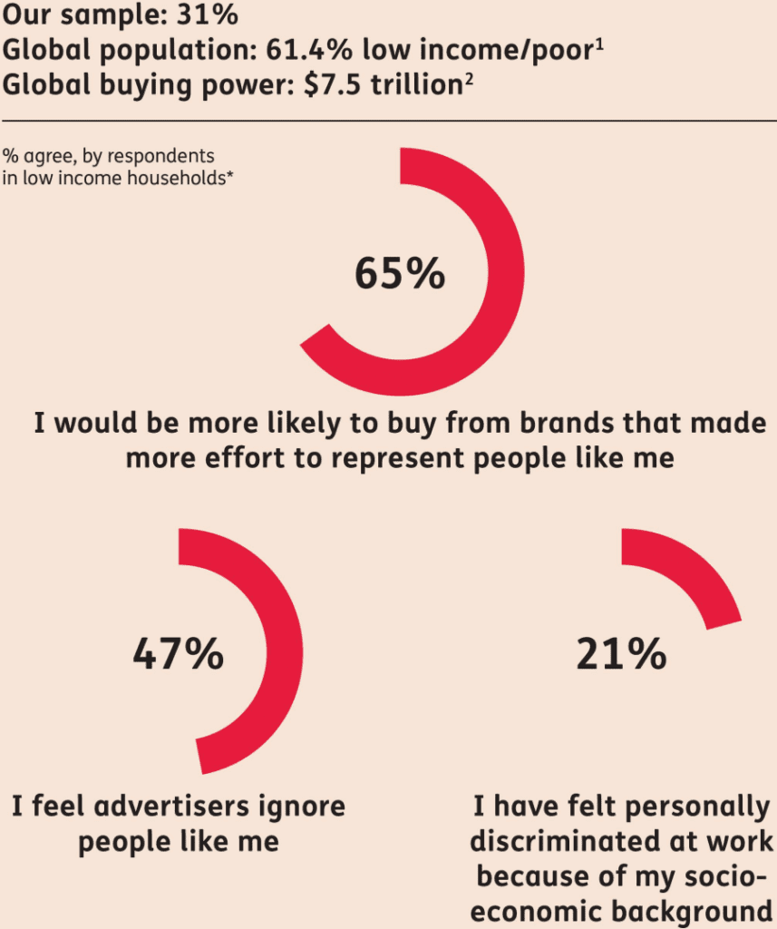 La complejidad de realizar una investigación en múltiples mercados e identidades hace que las dimensiones de la marginación sobre las que podemos informar se simplifiquen en esta investigación. Analizamos los datos de nuestra encuesta según seis dimensiones de identidad: género, raza, edad, sexualidad, discapacidad e ingresos. Pero la verdadera experiencia vivida por los individuos es, por supuesto, más complicada.