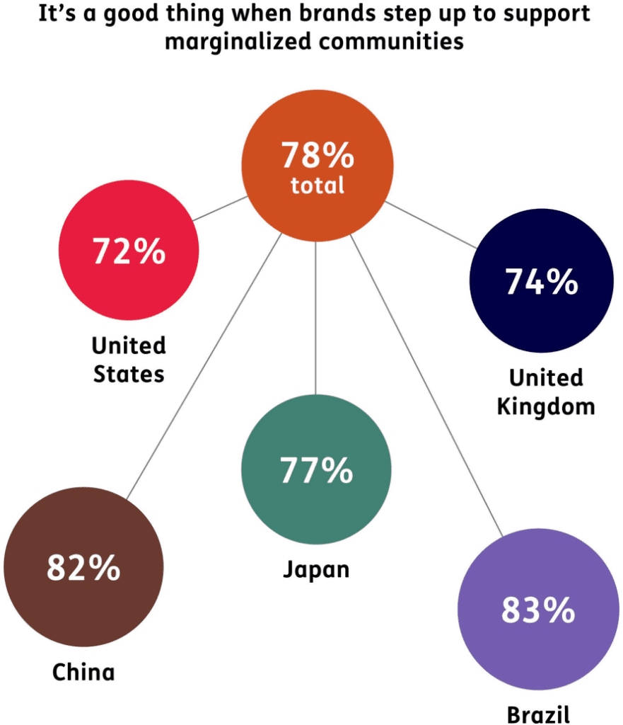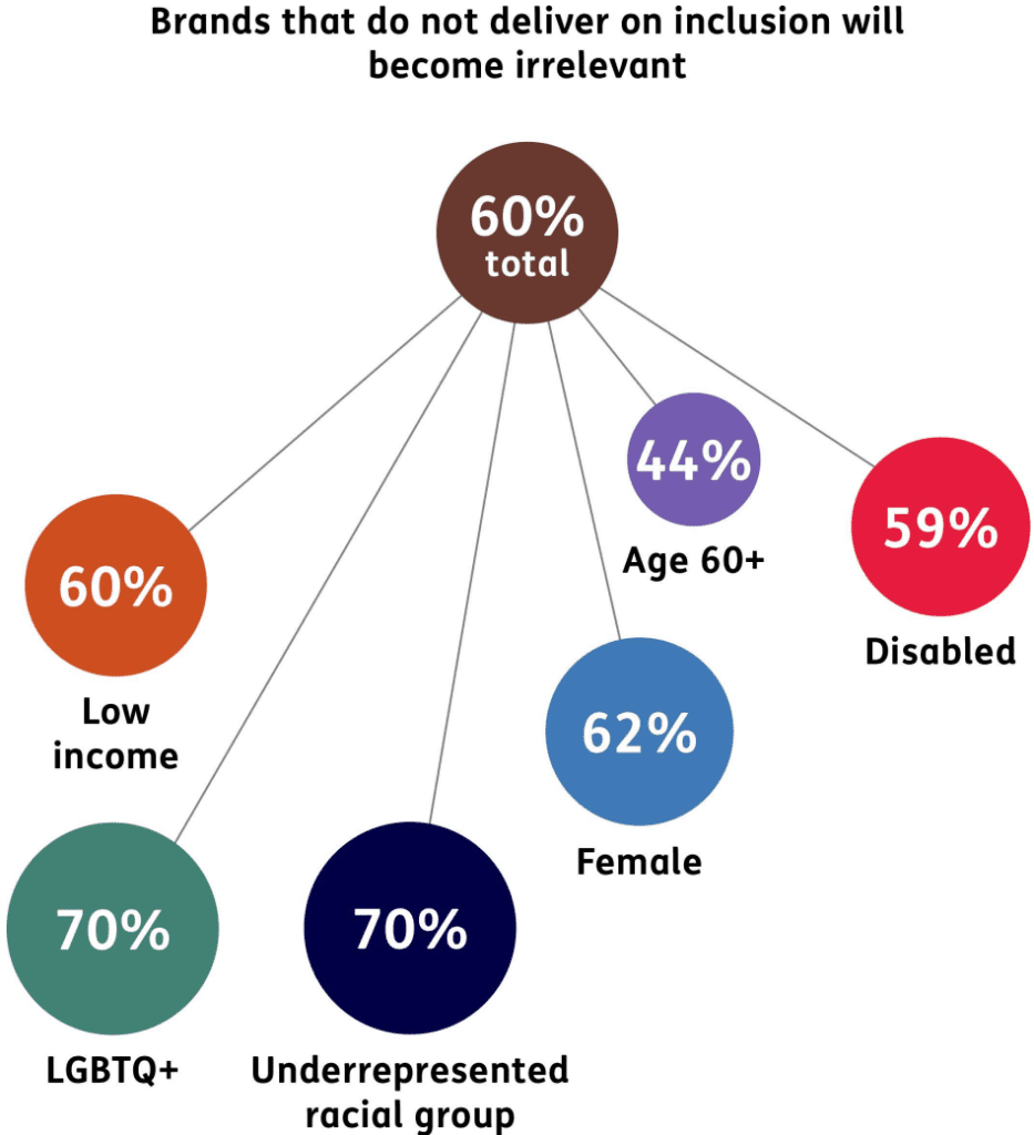 La gente espera ahora que las marcas hagan algo más que obtener beneficios. Hoy, el 78% dice que es bueno que las marcas den un paso adelante para apoyar a las comunidades marginadas; y el 60% dice que las marcas que no cumplen con la inclusión se volverán irrelevantes. Los grupos desatendidos también se hacen oír más, dice Mallon, que ha visto un aumento en la demanda de marcas inclusivas.