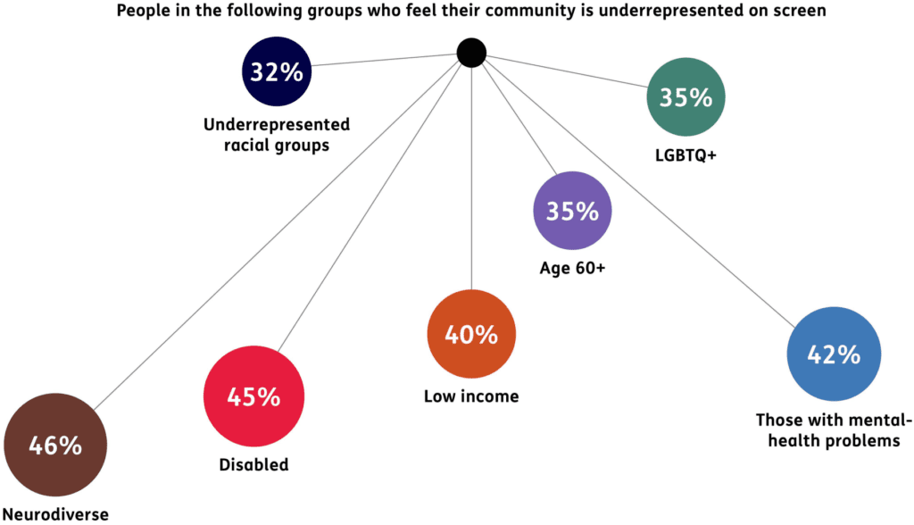 En cuanto a la industria, el “Informe sobre la Diversidad en Hollywood en 2022” concluye que las mujeres y las personas de color están infrarrepresentadas entre los directores y en la sala de redacción. El monitor inglés Diamond Diversity, hace un seguimiento de la representación en la producción televisiva, informa de que los discapacitados son el grupo más infrarrepresentado, seguido de los mayores de 50 años y los transexuales.