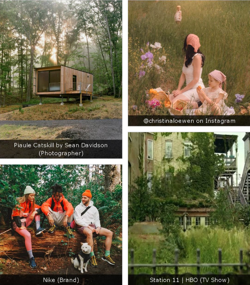 - Dos microtendencias muy influyentes satisfacen el anhelo de un mundo anterior al cambio climático: Cottagecore y Gorpcore. Mientras que Cottagecore ha estado creciendo durante varios años y Gorpcore es relativamente más nuevo, ambas tendencias estéticas indican el deseo de volver a la naturaleza y sumergirse en la vida al aire libre. Cottagecore se caracteriza por la moda pastoral preindustrial, que incluye sombreros de paja y delicados vestidos de pradera. Los tableros de inspiración de Cottagecore en Pinterest a menudo presentan cabañas de cuento de hadas invadidas por vegetación y exuberantes flores.