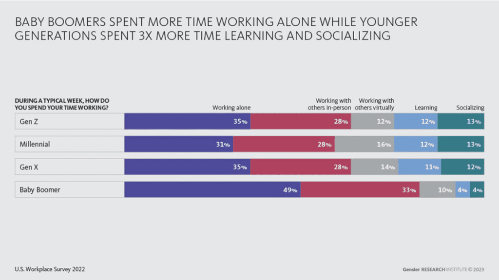 Hasta la pandemia, el tiempo dedicado a cada modo de trabajo era bastante consistente en todas las generaciones, con casi la mitad del tiempo dedicado a trabajar solo. En el último año, hemos visto una disminución significativa en el tiempo dedicado a trabajar solo, mientras que el tiempo dedicado tanto a socializar como a aprender ha aumentado del 5% al 12% de una semana laboral típica.