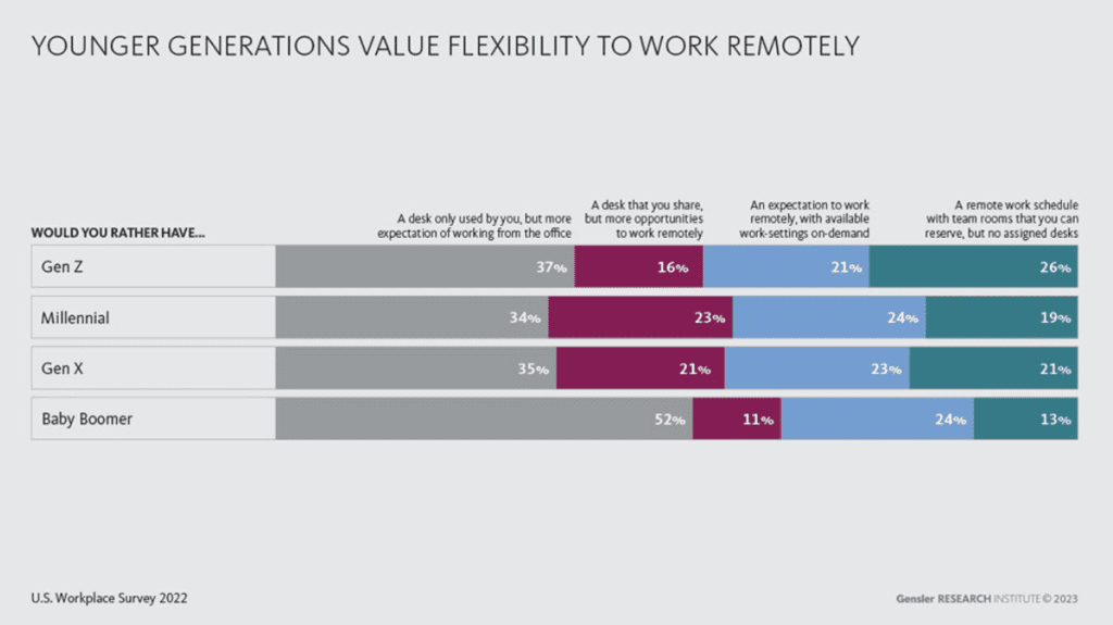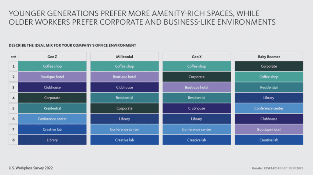 En la investigación sobre el entorno laboral realizada por Gensler en 2021, se descrubrió inicialmente un cambio mientras las organizaciones planeaban el regreso a la oficina, sin embargo, en la investigación más reciente sobre el entorno laboral se observa otro cambio notable en la forma en que las generaciones más jóvenes abordan el trabajo, con un mayor énfasis en el aprendizaje, la socialización y la flexibilidad, así como nuevas expectativas para la experiencia laboral.