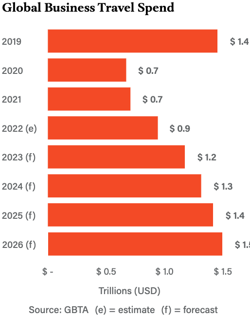 A pesar del optimismo generalizado por la recuperación en la industria de viajes, el pronóstico para los viajes de negocios sigue siendo incierto. En su Informe y Pronóstico Anual Global del Índice de Viajes de Negocios de noviembre de 2021, la Asociación Global de Viajes de Negocios (GBTA, por sus siglas en inglés) pronosticó un aumento en el gasto global en viajes de negocios en 2022 que impulsaría la recuperación total del segmento y alcanzaría los $1.4 billones de dólares registrados en 2019 para el año 2024. Sin embargo, para agosto de 2022, el informe de la GBTA contaba una historia diferente. Atribuyendo los problemas macroeconómicos globales que están “afectando el momento, la trayectoria y el ritmo de la recuperación de los viajes de negocios tanto a nivel mundial como por región”, la GBTA revisó sus expectativas de recuperación completa de los viajes de negocios para 2025 y 2026.