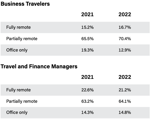 En 2021, el 15% de los viajeros de negocios creían que trabajarían completamente de forma remota una vez que las políticas temporales de la era de la pandemia se volvieran permanentes, y casi el 20% de los viajeros anticipaban que trabajarían completamente en la oficina. En 2022, a medida que se estableció una realidad más sólida, el 17% de los viajeros dijeron que ahora trabajan completamente de forma remota, el 70% están trabajando parcialmente de forma remota en modo “híbrido” y solo el 13% están trabajando completamente en la oficina.