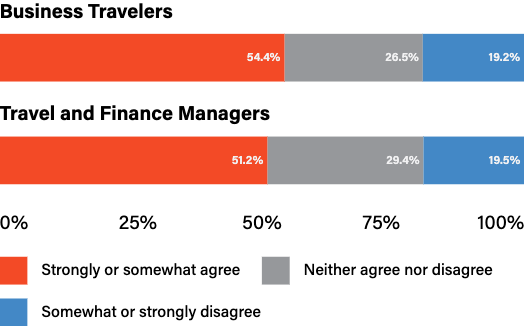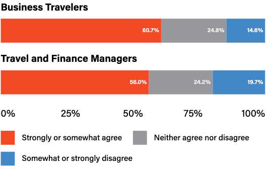 Más del 30%de los viajeros están muy satisfechos con el soporte de la tarjeta corporativa durante un viaje, en comparación con el 26% de los gerentes. La brecha fue menor cuando se trata de la satisfacción con las soluciones de gastos, con poco más del 28% de los viajeros “están totalmente de acuerdo” en que sus soluciones de gastos los respaldaron bien durante un viaje, en comparación con el 27% de los gerentes.