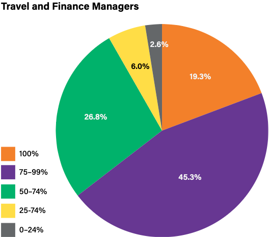 Los cambios constantes, y en algunos casos significativos, en la política de viajes en los últimos años podrían contribuir en parte al hecho de que más de un tercio (35%) de los gestores dijeron tener menos del 75% de cumplimiento por parte de los empleados. Esa cifra ha aumentado en un 7,6 puntos porcentuales desde la encuesta de 2021. Además, solo el 19% de los gestores dijeron que todos sus empleados cumplían completamente con las políticas de viaje en 2022, lo que representa una disminución significativa de 7,1 puntos porcentuales en comparación con la encuesta de 2021.