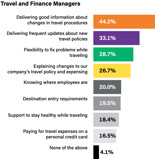 Otra prioridad no satisfecha para la satisfacción de los empleados es una comunicación mejorada y más rápida sobre las políticas de viaje nuevas y revisadas. Casi la mitad (48%) de los viajeros mencionaron “recibir información oportuna” como su principal preocupación, el 32% buscaba “actualizaciones frecuentes” y el 26% quería “entender los cambios en la política de viaje y los gastos de mi empresa”.