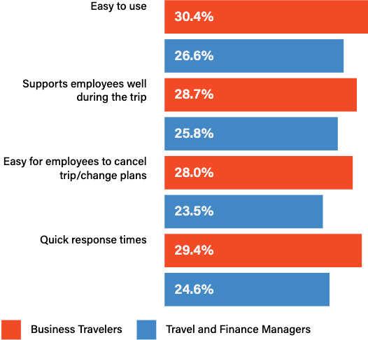 Sea cual sea el canal, la encuesta sugirió que ni los viajeros ni los gerentes confían en las soluciones de planificación de viajes de terceros. Los datos muestran que, como máximo, solo el 30% de los viajeros “están muy de acuerdo” en que sus agencias de viajes o plataformas merecen altas calificaciones en cuanto a facilidad de uso, soporte durante el viaje, flexibilidad para realizar cambios sobre la marcha y tiempos de respuesta. Las respuestas de los gerentes fueron aproximadamente de cuatro a cinco puntos porcentuales más bajas al clasificar estas mismas áreas de servicio.