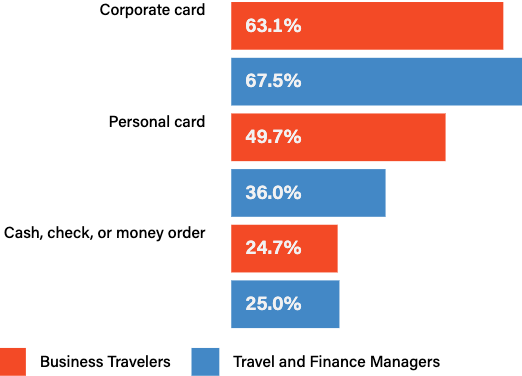 En general, el 63% de los viajeros en la encuesta de este año dijeron que pagan los gastos de viaje con tarjetas de la empresa, un aumento significativo con respecto al 48% en la encuesta de 2021, mientras que el 50% paga algunos gastos de viaje con tarjetas personales.
