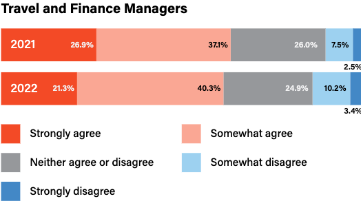 “Nuestra empresa estaría interesada en una solución de viajes que proporcione una plataforma de viajes y gastos más unificada, en lugar de soluciones separadas”. 2021 frente a 2022