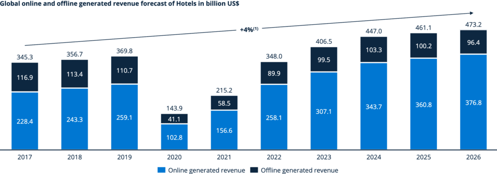 En la última década, los hoteles se han vuelto muy dependientes de las plataformas de reservas en línea. La mayoría de las habitaciones de hotel ya se reservan en línea a través de plataformas de reserva de viajes en línea, y solo una minoría de las reservas de hotel se realizan directamente en los sitios web de los hoteles o por teléfono. Los hoteles pagan comisiones a las agencias de viajes en línea (OTA) por las reservas realizadas a través de ellas. Otro aspecto de esta dependencia es la importancia de las opiniones de los huéspedes sobre los hoteles escritas en los sitios web de reserva en línea.