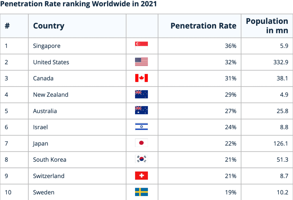 La tasa de penetración de usuarios es más alta en Singapur, seguida de EE. UU. y Canadá