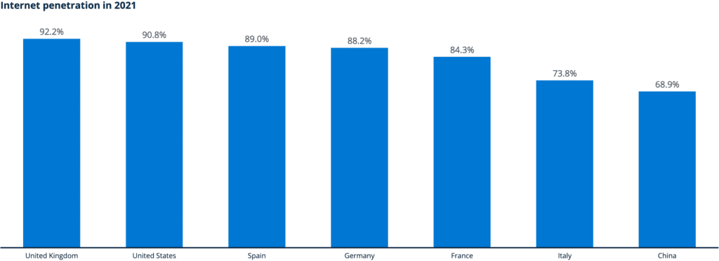 La penetración de Internet es especialmente alta en algunos países europeos, mientras que el progreso en China es significativamente menor